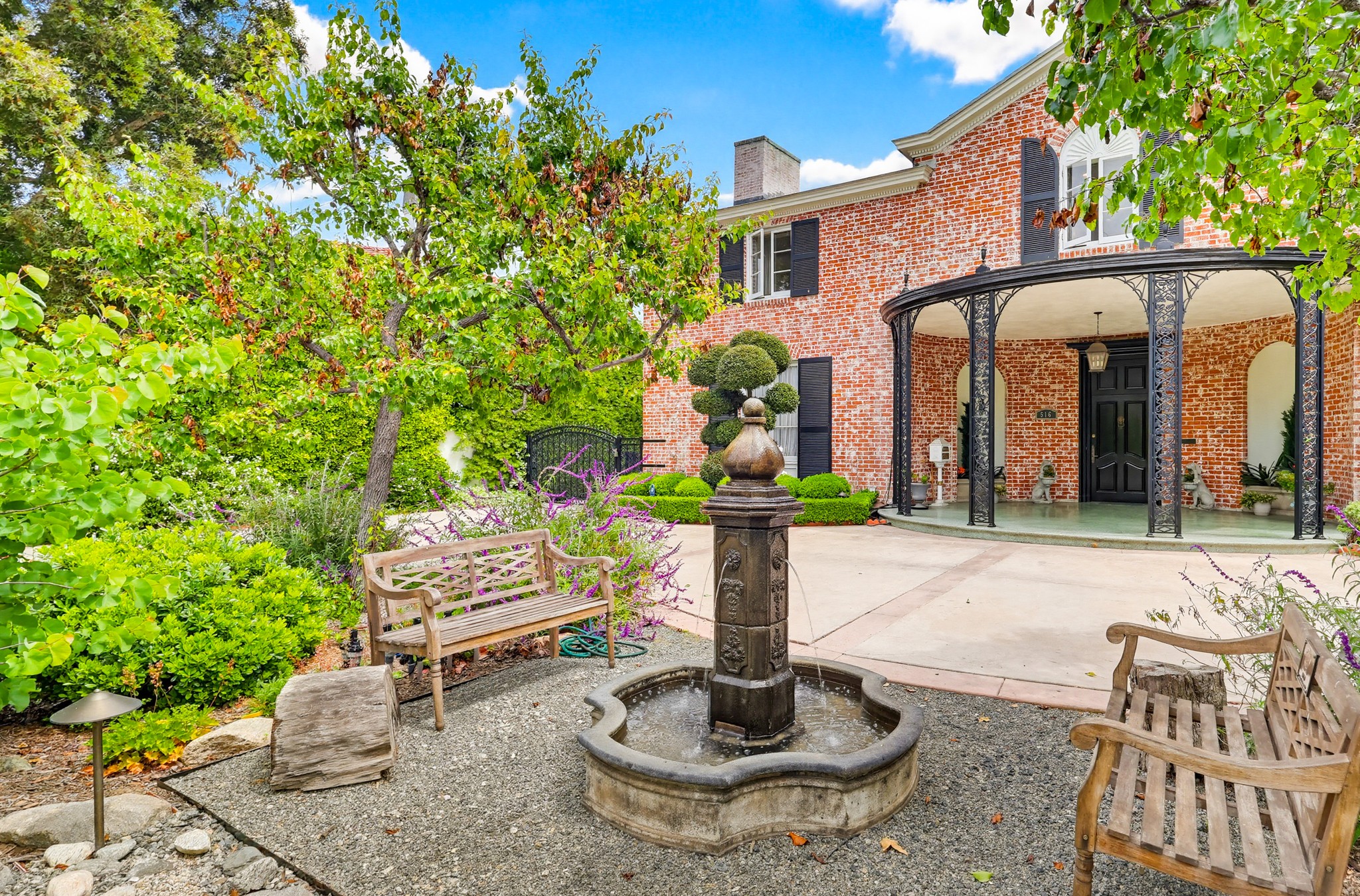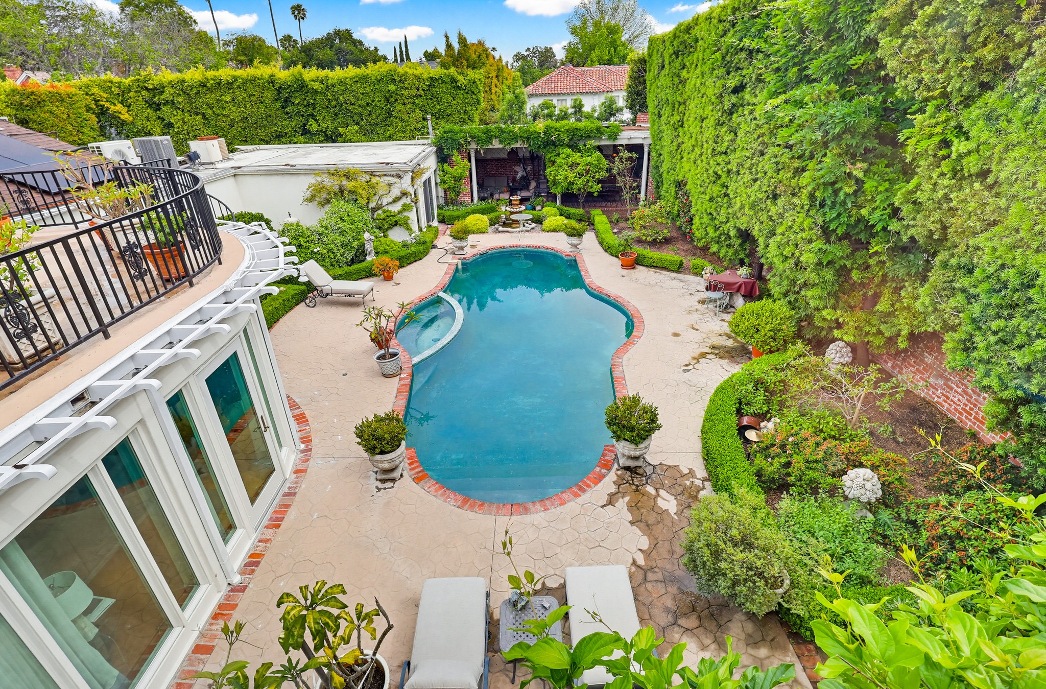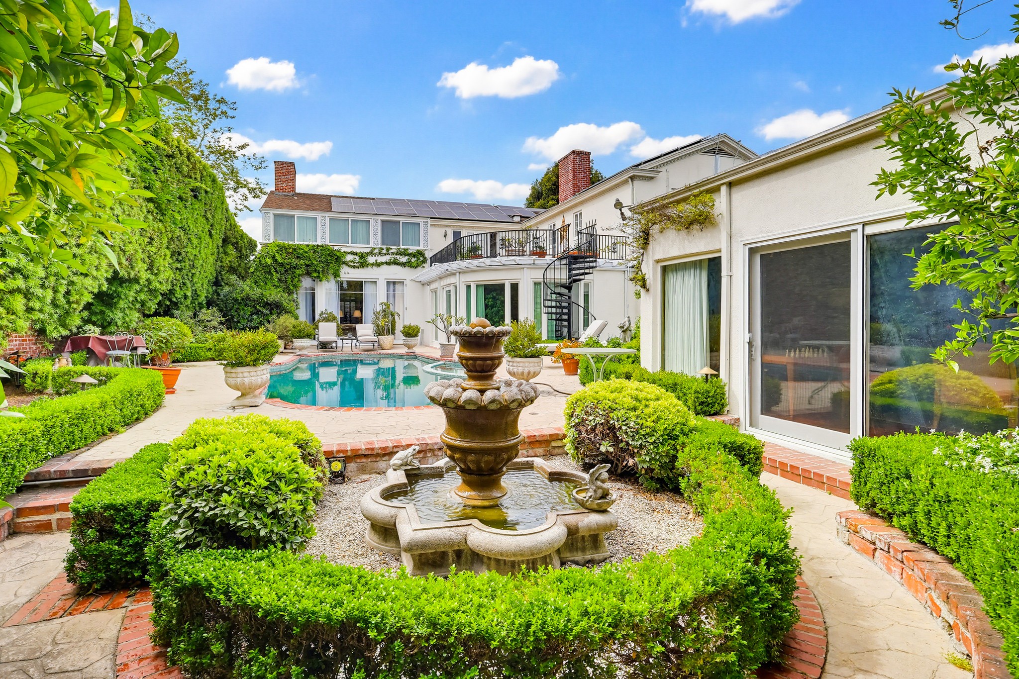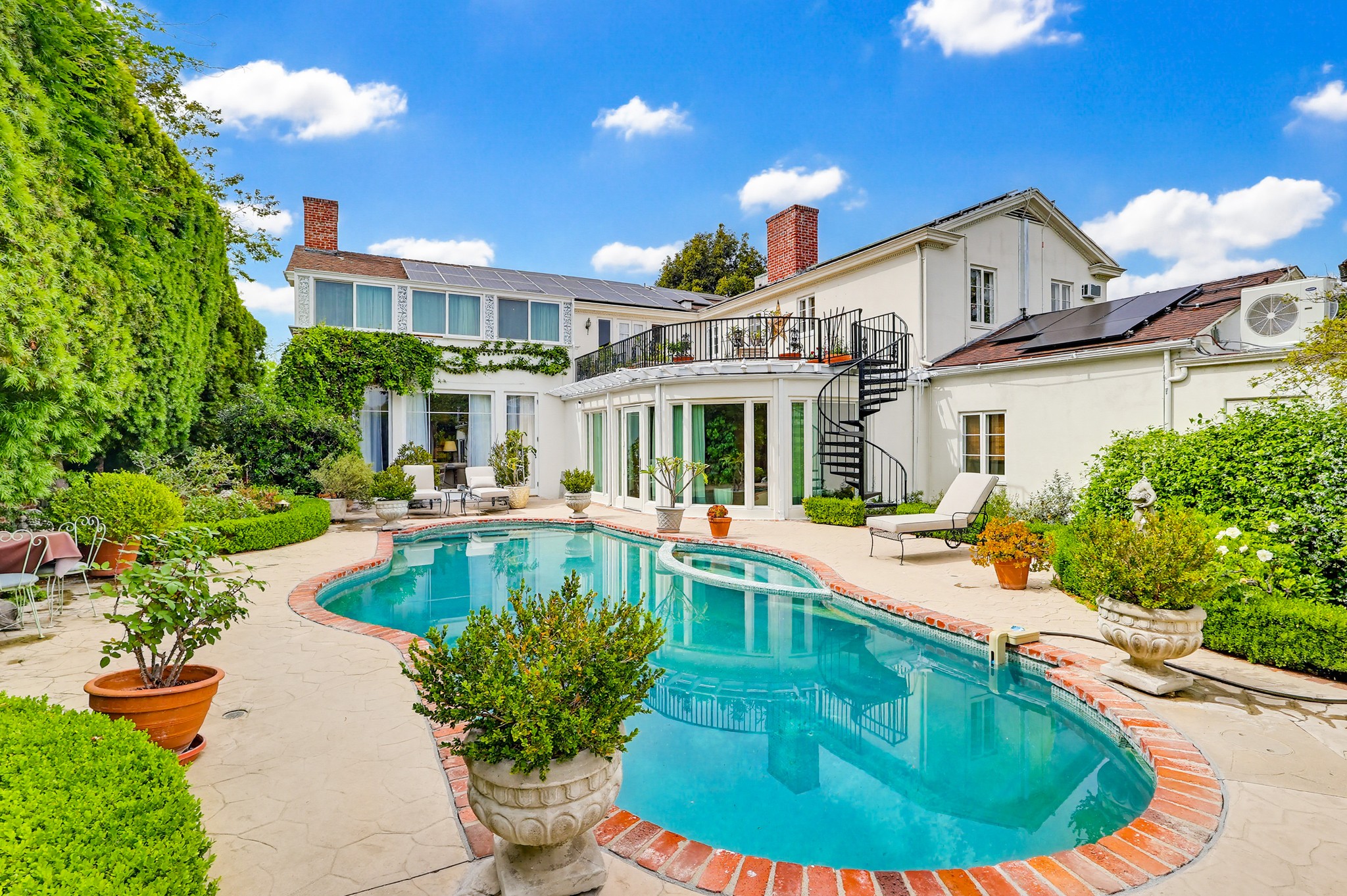 Spectacular Wallace Neff c.1941, but updated gorgeously to modern standards while keeping the classic details. Located in true Hancock Park! Nearly 6800 square feet in the house and on a 16,000+ lot. 4 bedrooms total (3 up) with each having their own bathroom. 2 story oval entry with curving staircase. Formal Living & Dining rooms; Gourmet kitchen, wet bar/butler's pantry,2 family rooms, 2 laundry rooms (one is combined with a guest kitchenette! Back stairs for more direct Kitchen access; upstairs deck overlooking pool/spa, gardens & a covered brick patio with cozy sitting & dining area,BBQ,sink/drinks fridge for all your parties! 3 solar PowerWalls for reduced electric bills, carport behind driveway gates,security system and more! 13monthlease minimum, unfurnished or furnished for a negotiable higher lease rate. Superb!
